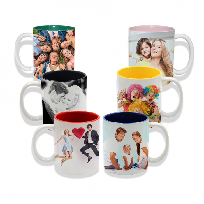 Tazza bianca in ceramica da 33 cl con interno colorato MANICO BIANCO completa di scatola. Altezza 10 cm circa.