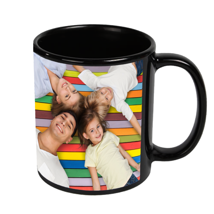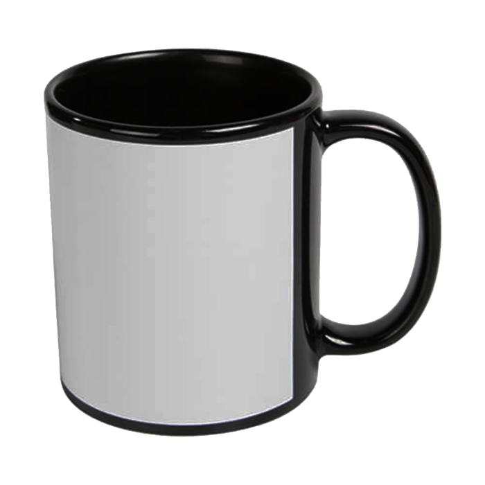 Tazza nera (fascia bianca) in ceramica da 33 cl completa di scatola. Altezza 10 cm circa. Area stampabile massima 8,6x20 cm.