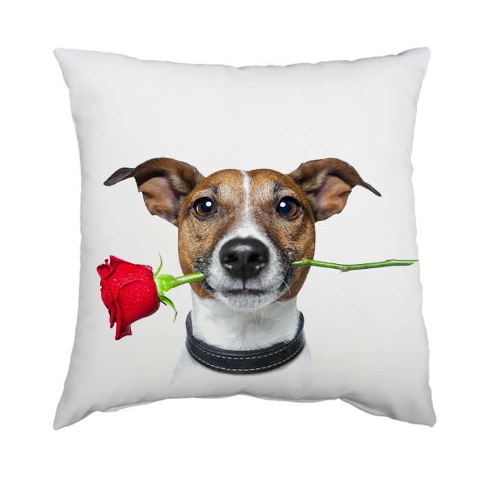 Cuscino in poliestere opaco, formato 40x40 cm circa con stampa personalizzata sul fronte e retro con grafica.