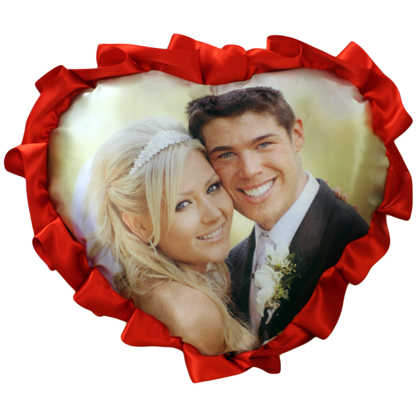 Cuscino in raso a forma di cuore con volant, formato 41x38 cm con stampa personalizzata nel fronte e retro rosso