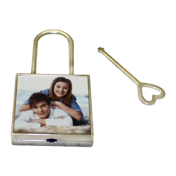 Lucchetto in metallo con chiave. Misure 4 x 8 cm circa Area stampabile 3,7 x 3,7 cm