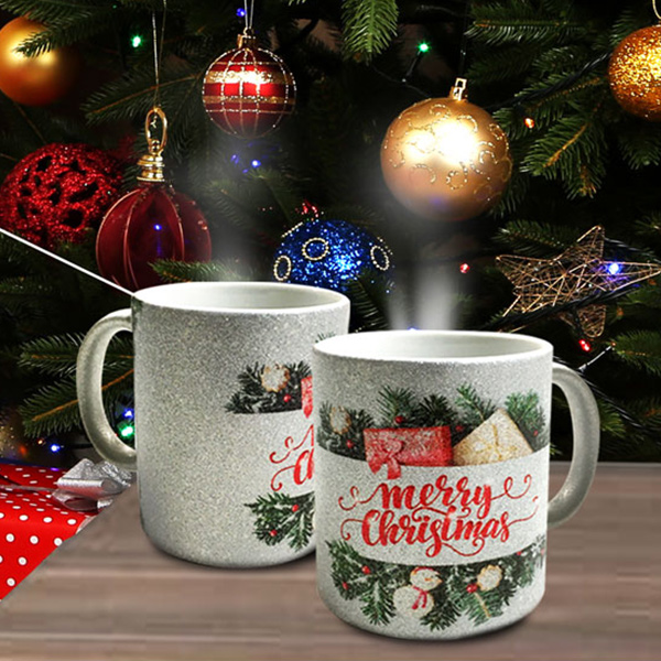 Tazza Silver glitterata in ceramica da 33 cl completa di scatola. Altezza 10 cm circa.