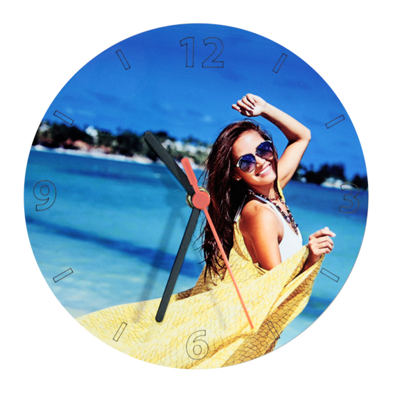 Orologio rotondo in legno mdf, spessore 3 mm con gancio da parete e numeri incisi nell'oggetto.