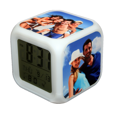 Sveglia con datario e rilevatore di temperatura a forma di cubo con illuminazione a led multicolore, personalizzabile in 3 lati. (Parte superiore, destra e sinistra del display) Misure 8x8x8 cm