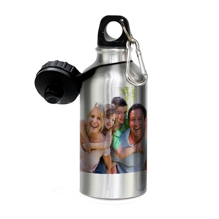Borraccia in alluminio argento da 60 cl con moschettone. Altezza 15 cm circa. Area stampabile massima 9 x 15 cm.